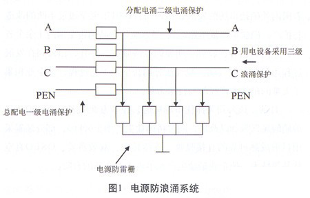 智能儀表控制系統(tǒng)的電源是從配電系統(tǒng)進入計算機主控室。電源系統(tǒng)是從發(fā)電廠通過變壓器、配電系統(tǒng)最后供儀表系統(tǒng)使用,在雷暴天氣中電源輸送進由于環(huán)韋多途徑長,極可能遭受雷擊,因此此時的電源并不是380v或220v、50Hz交流電,而是參雜了各種雜波的浪涌電壓,如果不設(shè)置防浪涌保護系統(tǒng),那么使用中的電器設(shè)備會因超過耐壓極限而發(fā)生事故。將總配電進來的A、B、C、D三線四相并接至電源浪涌器所相對的A、B、C、D接線柱上。在雷暴時感應雷浪涌通過電涌保護器保護將過載電流匯入大地,輸出電壓鉗制在安全工作區(qū)內(nèi),確保電源安全運行。電源防浪涌系統(tǒng)如圖1所示。