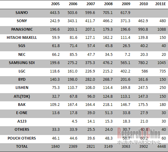 2005-2011年全球主要鋰電池廠家出貨量(單位:百萬單元)