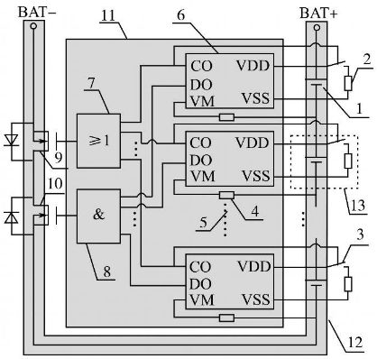 采用單節鋰電池保護芯片設計的具備均衡充電能力的鋰電池組保護板示意圖如圖1所示。其中:1為單節鋰離子電池;2為充電過電壓分流放電支路電阻;3為分流放電支路控制用開關器件;4為過流檢測保護電阻;5為省略的鋰電池保護芯片及電路連接部分;6為單節鋰電池保護芯片(一般包括充電控制引腳CO,放電控制引腳DO,放電過電流及短路檢測引腳VM,電池正端VDD,電池負端VSS等);7為充電過電壓保護信號經光耦隔離后形成并聯關系驅動主電路中充電控制用MOS管柵極;8為放電欠電壓、過流、短路保護信號經光耦隔離后形成串聯關系驅動主電路中放電控制用MOS管柵極;9為充電控制開關器件;10為放電控制開關器件;11為控制電路;12為主電路;13為分流放電支路。單節鋰電池保護芯片數目依據鋰電池組電池數目確定,串聯使用,分別對所對應單節鋰電池的充放電、過流、短路狀態進行保護。該系統在充電保護的同時,通過保護芯片控制分流放電支路開關器件的通斷實現均衡充電,該方案有別于傳統的在充電器端實現均衡充電的做法,降低了鋰電池組充電器設計應用的成本。