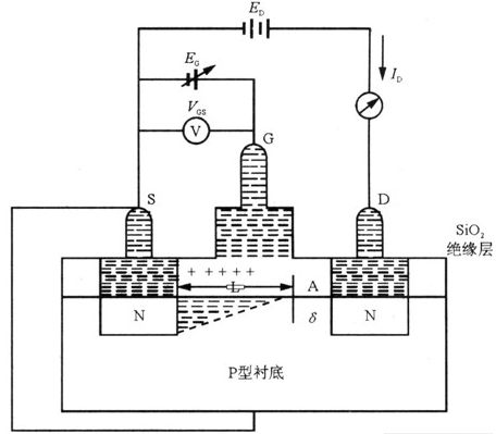 圖1所示是增強型絕緣柵場效應管的結構原理。圖1中,襯底與源極相連,令VGS≤0或為很小的正電壓,即使VDS為正電壓,由于漏極和襯底之間的PN結為反向偏置或絕緣層和襯底界面上感應的少量電子被P型襯底中的大量空穴所中和,故可使得ID=0或ID≈0。當VGS超過開啟電壓VT時,強電場就會積累較多的電子,因而在襯底的表面感應出一個N型層,稱為導電溝道或者反型層。由于感應出的反型層與漏源之間的N區沒有PN結勢壘,故有良好的接觸,這樣就產生了ID,即增強型場效應管導電的基本要求是:VGS≥VT。