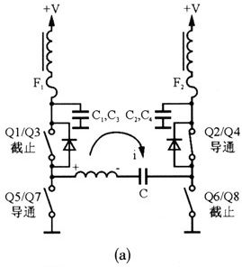 因為在用的功放模塊產生的射頻電流必須流過合成變壓器的次級,并在已關斷的射頻功放模塊的初級繞組上感應出射頻電壓。根據楞次定律,變壓器次級電流所產生的磁通總是試圖抵消初級電流所產生的磁通,所以,流過關斷功放輸出變壓器次級的電流感應到初級的電壓后,一定和原來的輸出電壓極性相反。在如圖6(a)所示,由次級電流感應到初級的電壓為左正右負,說明關斷的射頻功放在導通狀態下的變壓器初級電壓極性是左負右正,與此相對應的導通管為Q2/Q4,截止管為01/Q3,從而形成的低阻抗通路為:與Ql/Q3相并聯的反向二極管→旁路電容C1、C3→旁路電容C2、C4→Q2/Q4→隔直電容C。同理,圖6(b)所形成的低阻抗通路為:與Q2/Q4相并聯的反向二極管→旁路電容C2、C4→旁路電容C1、C3→Q1/Q3。
