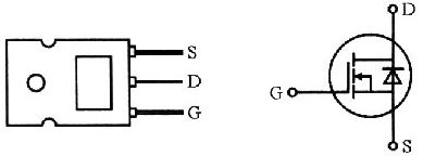 圖7所示為IRFP360的外型及表示符號。它的特點,一是具有隔離式的中心裝配孔,并有重復性的雪崩定額;二是漏源之間并聯有反向二極管,其電壓變化率定額很大而且驅動電路比較簡單,此外,同型號的管子并聯也很容易。然而,由于MOS管的柵極輸人阻抗較高,容易產生較高的感應電壓,從而導致柵極易擊穿,所以在維護中應特別注意。