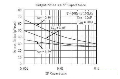 為降低基準噪聲,用于連接基準旁路電容。增大旁路電容能夠使基準噪聲成為產生LDO輸出噪聲的次要因素,有利于減小輸出噪聲。建議使用陶瓷電容的典型值為 470 pF 到 0.01 µF 。也可使用此范圍以外的電容,但會對輸入電源上電時LDO 輸出電壓上升的速度產生影響,旁路電容值越大,輸出電壓上升速率越慢。在使用時這點要注意。