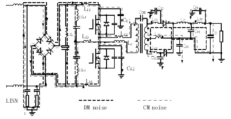 通常電路中的共模干擾和差模干擾是同時存在的,共模干擾存在于電源的任意一個相線與大地之間,差模干擾存在于相線與相線之間。法國Grenoble 電技術實驗室的Teuling、Schnaen 和Roudet 基于由MOSFET 構成的400W、開關頻率為100KHz 的斬波電路實驗模型的研究表明,低頻時差模干擾占主導地位;高頻時,共模干擾占主導地位,這說明開關電源的差模干擾和共模干擾對電路的影響程度是不同的;另一方面,線路寄生參數對差模干擾和共模干擾的影響也不同,由于線間阻抗與線———地阻抗不同,干擾經長距離傳輸后,差模分量的衰減要比共模大。因此,為了解決開關電源的傳導噪聲問題,需要首先區分共模和差模干擾,這就需要建立共模和差模噪聲路徑,然后對它們分別進行仿真和分析,這種方法便于我們找到電磁干擾問題的根源,便于問題的解決。