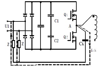 在PWM變換器工作時,伴隨著開關器件的工作,也相應產生了共模噪聲。如圖1 所示,對于半橋變換器,開關管Q1 的漏級電壓始終為U1,源級電位隨開關狀態的改變而在0 和U1/2 之間變化;Q2 的源極電位始終為0,漏極電位在0 和U1/2之間變化。為使開關管和散熱器能保持良好接觸,往往在開關管底部與散熱器之間加上絕緣墊片或者抹上導熱性能良好的絕緣硅膠。這使得A 點對地之間相當于存在一個并聯耦合電容CK。當開關管Q1、Q2 的狀態發生改變,使A 點電位發生變化時,就會在CK 上產生噪聲電流Ick,如圖2 所示。該電流由散熱器到達機殼,而機殼也即大地與主電源線存在耦合阻抗,形成圖2中虛線所示的共模噪聲通路。于是,共模噪聲電流在地與主電源線的耦合阻抗Z 上產生壓降,形成共模噪聲。