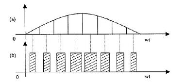在采樣控制理論中有一個重要的結論:沖量相等而形狀不同的窄脈沖加在具有慣性的環節上,其效果基本相同。沖量指窄脈沖的面積。效果基本相同指環節的輸出響應波形基本相同。如把各輸出波形用傅氏變換分析,則其低頻特性非常接近,僅在高頻段略有差異。這一結論是PWM控制的重要理論基礎。如圖1(a)所示,將正弦半波看成由N 個彼此相聯的脈沖組成的波形。這些脈沖寬度相等,但幅度不等,且脈沖的頂部為曲線,各脈沖的幅值按正弦規律變化。如果將上述脈沖序列用同樣數量的等幅不等寬的矩形脈沖序列代替,使矩形脈沖的中點和相應正弦波部分的中點重合,且使矩形脈沖和相應的正弦波部分面積相等,就得到圖1(b)所示的脈沖序列。像這種脈沖寬度按正弦規律變化而和正弦波等效的波形即為SPWM波形。