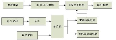 本設計包括單片機最小系統、整流及電源電路、DC-DC 升壓電路、SPWM 轉換電路、H 橋逆變電路等幾個模塊,由于系統需要完成輸出電壓和頻率的檢測和顯示,因此需要設計電壓、頻率采樣電路、A/D 轉換電路、數碼管顯示電路等。系統的總體設計框圖如圖3 所示。