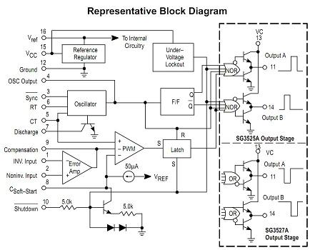 系統采用 SG3525 來實現SPWM 控制信號的輸出,該芯片其引腳及內部框圖如圖4: