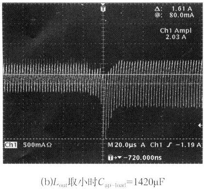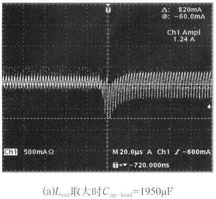 輸出電壓的穩定過程中,一方面由輸出濾波電感的儲能來逐步補充,另一方面由反饋環控制電路原邊快速輸出更大功率。輸出電感的取值一般由電流紋波系數λ和電源的空載特性來確定,為了避免容性跳變輸出電壓過大的下沖,使控制電路達到極限,電感的取值要大于λ的理論值計算所得數值,但同時也要考慮輸出失載時的電壓上沖幅度,所以輸出電感也不能太大,大的電感一般不易制作、成本較高,所以電感的實際取值可以用實驗的方法得到。圖4給出了輸出電感Lout不同取值時,容性負載突變時輸出電感電流的跳變波形和最大的容性負載能力。