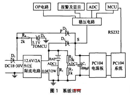 系統(tǒng)使用直流18~ 30 V 輸入, 可以直接使用筆記本電源。D1 用于防止電源方向插反。12. 6 V/ 2 A 恒壓限流電路為本電路核心, 在輸出電壓低于12. 6 V 時(shí)工作在2 A 恒流狀態(tài), 當(dāng)輸出電壓達(dá)到12. 6 V 時(shí),使輸出電壓恒定。D2、D3 和C1 完成電源切換功能。外部電源供電時(shí), 由于P 端電壓總是保持在12. 6 V 以上, S 端通過(guò)外部電源供電, 若無(wú)外部電源時(shí), 由于電池電壓比P 端的電壓高, 則通過(guò)電池對(duì)系統(tǒng)進(jìn)行供電。穩(wěn)壓電路主要負(fù)責(zé)將S 端的電壓轉(zhuǎn)換為系統(tǒng)所需的各種電壓。ADC1 和A DC2 分別為電流和電壓采集端, ADC1 和ADC2 端的信號(hào)經(jīng)過(guò)OP 電路放大,然后輸入到ADC 電路, MCU 把各種相關(guān)數(shù)據(jù)通過(guò)RS232傳送到PC104 系統(tǒng)。R4 和D4 完成供電狀態(tài)的檢測(cè),用于檢測(cè)系統(tǒng)是外部電源供電還是電池供電,使系統(tǒng)自動(dòng)調(diào)整自動(dòng)關(guān)機(jī)或自動(dòng)待機(jī)的等待時(shí)間。電路同時(shí)提供聲光方式的報(bào)警及顯示功能, 當(dāng)出現(xiàn)電壓過(guò)低等情況時(shí),能以比較醒目的方式進(jìn)行提醒。PC104 電源板和PC104 系統(tǒng)是本電路的負(fù)載。電路中D1 、D2 、D3均為肖特基二極管,肖特基二極管具有正向壓降低、反向恢復(fù)時(shí)間短等優(yōu)點(diǎn); R1 、R2、R3 為1 %精密電阻。