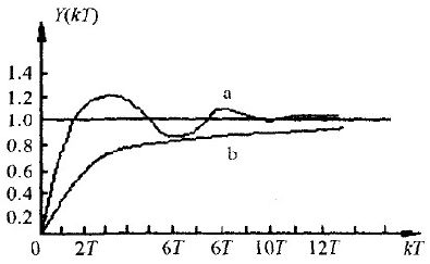 恒偏差法和有效偏差法相類似。有效偏差法又叫逆算法。即當控制量Uk越限時,Uk取邊界值Umax或Umin.由該邊界值逆算出偏差值Ek''代替原來的偏差值Ek.然而,在恒偏差法中,是用經過衰減后的Ek''去代替Ek.系統在階躍響應時,實際工作在過阻尼狀態,從而減緩了在起、停時對主電路器件的沖擊。圖3示出兩種算法的階躍輸入響應曲線。其中曲線(a)標準PI算法響應曲線、曲線(b)恒偏差法響應曲線。