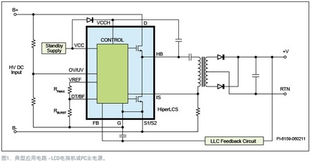 在高壓電源轉(zhuǎn)換電路設(shè)計(jì)中,諸如電源噪聲、開關(guān)頻率、開關(guān)損耗、電源體積、可靠性等問題一直是關(guān)鍵所在。與其它的高壓拓?fù)浣Y(jié)構(gòu)相比,LLC轉(zhuǎn)換器因效率高且設(shè)計(jì)的電源體積小,在高壓電源適用領(lǐng)域一直受到設(shè)計(jì)師的青睞,不過其設(shè)計(jì)難度也非常大。Power Integrations公司(PI)不久推出的HiperLCS系列LCS700-708高壓LLC電源IC,將變頻控制器、高壓端和低壓端驅(qū)動(dòng)器以及兩個(gè)MOSFET同時(shí)集成到了一個(gè)低成本封裝中,具有出色的設(shè)計(jì)靈活性,其最高負(fù)載效率超過97%,并利用高頻開關(guān)來減小變壓器的尺寸和輸出電容的占板面積,由此達(dá)到縮小電源尺寸的目的。圖1所示為HiperLCS功率級的電路簡圖,其中LLC諧振電感集成在變壓器中。變頻控制器通過零電壓(ZVS)開關(guān)功率MOSFET,消除開關(guān)損耗,從而達(dá)到高效率。