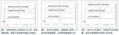 圖4顯示的是輸入電壓為265V交流時電路的工作情況。軌跡1表明,由于其輸入電壓高,Q1導(dǎo)通時間短。而軌跡2則顯示仍保持有充足的能量給Q1充電,在關(guān)斷周期內(nèi)也能維持通過LED的電流。