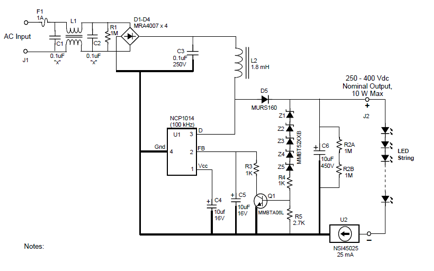 美國安森美公司加了一個功率因素校正芯片NCP1014的恒流二極管的電源,其電原理圖見圖12。