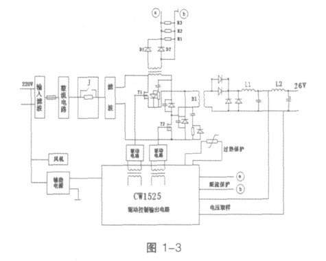 以上是開關電源基本原理和控制方式的介紹,結合我們實際工作中固態發射機開關電源控制方式以及理論理解,使我對大功率開關電源原理、整體控制方式有了進一步的認識。現以5kW- 14CH 大功率合放式全固態電視發射機直流26V/100A 正激開關電源變換器的工作原理和維修方法來簡單介紹一下,如圖1- 3 所示: