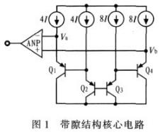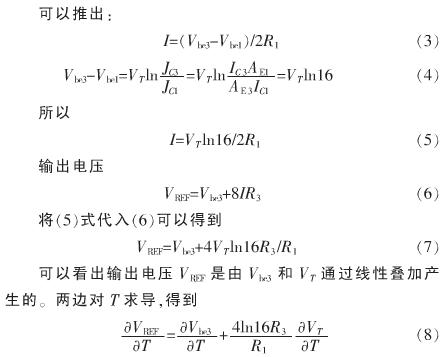 本文提出的電路核心結構如圖1所示,在電路中雙極晶體管構成了電路的核心,實現了VBE與VT的線性疊加,獲得近似為零溫度系數的輸出電壓。圖1中雙極型晶體管Q1和Q2的發射區面積相同,Q3和Q4的發射區面積相同,考慮設計需求,取Q1和Q2的發射區面積為Q3和Q4的發射區面積的8倍。