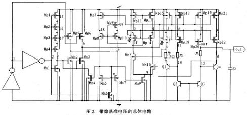 帶隙基準電壓源總體電路總共由4部分組成:A部分是啟動電路,B部分提供偏置電壓,C部分是運算放大器,D部分是帶隙電壓源的核心部分。其中核心部分是由雙極晶體管構成,實現了VBE和VT的線性疊加,獲得近似零溫度系數的輸出電壓。總體電路如圖2所示。