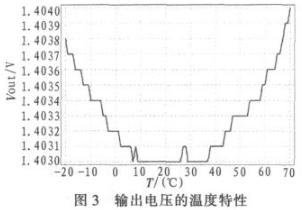 該電路的仿真基于Chartered 0.25 μm models。仿真軟件是T—SPICE,電源電壓為3.3 V,R3/R1的比值為2.306 6,這樣的結果在版圖設計中比較容易實現,可以采用單元電阻串連的形式,有利于減少因為版圖失配引起的誤差。單元電阻的W=3μm,L=10 μm,方塊電阻R=330 Ω,采用的第一層多晶實現。圖3所示的是輸出電壓溫度特性的仿真結果。