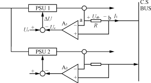 如圖5所示,當輸出達到均流時,輸出電流I1為零。反之,則電阻R上由于有電流I1流過,在其兩端產生一個電壓Uab,這個電壓經過放大器A輸出電壓Uc,它與基準電壓Ur比較后的ΔU,反饋回電源模塊的控制部分,從而調節輸出電流,最終實現均流。