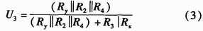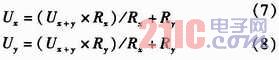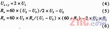 如圖2所示,U+和U-為被測線路的母線供電電壓,正常工作時兩母線間的電壓差Ux+y為440 V,且隨蓄電池內阻變化。Rx,Ry分別為被測線路的正母線絕緣電阻和負母線絕緣電阻。正、負母線絕緣電阻反映的是64路的正、負支路的總體絕緣性能,等效于各個支路的正、負絕緣電阻的并聯,正常時兩母線絕緣電阻>20 kΩ。Ux和Uy為正負母線對地電壓,大小隨正負母線的絕緣電阻變化,但兩母線電壓差恒定為Ux+y。為了檢測正負母線電壓Ux,Uy,Rx,Ry,系統采用了“平衡-不平衡檢測法”檢測母線電壓和母線絕緣電阻。計算公式如式(1)所示。
