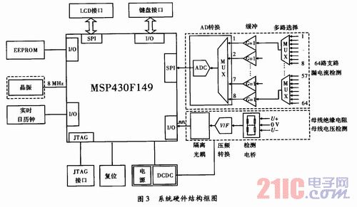 直流接地檢測系統采用低功耗處理器MSP430F149為硬件核心,外圍電路可分為數據采集模塊、人機交互模塊、處理器模塊。數據采集模塊負責檢測64路支路的漏電流、母線電壓、母線絕緣電阻;人機交互模塊負責進行液晶顯示和鍵盤輸入;處理器模塊負責協調整個系統的數據處理,數據存儲,人機交互等。具體的硬件結構框圖,如圖3所示。
