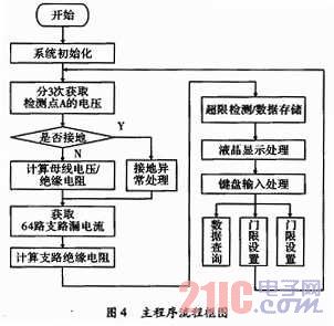 整個程序的編寫均由C語言完成,在程序設計中,采用了結構化程序設計方法,使各個模塊程序相對獨立,便于程序代碼的維護、移植和升級。同時,這樣分離式的程序設計,降低了代碼的調試難度,縮短了調試周期。將與接地故障信息(如母線電壓,母線絕緣電阻,支路絕緣電阻,接地支路號等)密切相關的數據放在一個結構體里,便于掉電存儲與回放顯示。系統的主程序流程圖,如圖4所示。