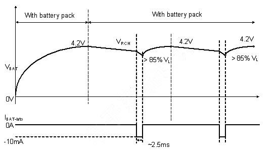 使用者亦有可能在充電或式充電完畢后,在未將電源移除的情況下,即抽離電池的情況。為避免造成危險,IC內(nèi)部應(yīng)具有如圖7, 8的電池存在偵測機(jī)制。充電IC會以短時間脈沖(每370ms產(chǎn)生2ms的脈沖)方式抽取電池電流,此時若電池存在,則偵測到的電池電壓應(yīng)大于一預(yù)設(shè)閥值;若電池已切離,則充電IC偵測到一低電壓,即可判定為電池?cái)嚅_狀態(tài),并將電池端電壓切斷,保護(hù)使用者安全。