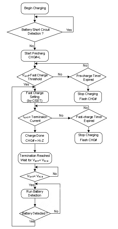 圖6所示為鋰離子電池充電器的標(biāo)準(zhǔn)充電流程,首先充電IC偵測是否有輸出短路或是過載的保護(hù)模式,若系統(tǒng)一切正常接著偵測電池初始電壓是否達(dá)到3V以上,高于3V者就直接以快充模式進(jìn)行高電流充電,若電池低于3V者,進(jìn)入預(yù)充電模式,以快充的10%進(jìn)行充電,喚醒電池并避免電池?fù)p壞。在預(yù)充電階段,仍隨時偵測電池電壓,達(dá)到3V后可隨即切入快充模式。