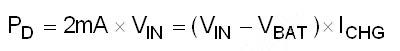 假設(shè)使用5.5V電源供應(yīng)器對單顆1200mAh鋰離子電池進(jìn)行充電,在0.7°C快速充電電流時,且電池電壓為3V的條件下,可以預(yù)估IC運(yùn)作的最大耗電量為,1.762W的耗電最大值,此一功耗會使得熱阻抗60°C /W的3×3毫米QFN封裝溫度溫升127°C,即便環(huán)境溫度0°C時,也已經(jīng)超過所允許的125°C硅晶片操作溫度最大值。若設(shè)定充電電流為0.6A(0.5C),則可降低IC溫升為90度,可以操作于35度的環(huán)境溫度中,因此是較佳的設(shè)定電流。