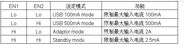LD6275將電源適配器/USB埠的5V直流電源進(jìn)行降壓穩(wěn)流,對鋰離子電池進(jìn)行充電,為防止電源適配器的過電流超載,可以外部電阻RCISET設(shè)定最大充電電流限制。同時支援電腦USB埠充電模式,并依據(jù)外部腳位EN1與EN2進(jìn)行設(shè)定,各模式請見表1.透過為USB 500mA與USB 100mA操作模式設(shè)定,可以保護(hù)PC端USB埠避免過載。