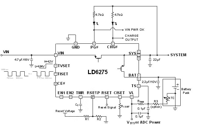為滿足低耗電可攜式產(chǎn)品對于更精確、更安全的充電器應(yīng)用需求,許多IC制造商發(fā)展出低成本線性充電器。圖2是以通嘉科技的LD6275充電IC為設(shè)計(jì)范例,構(gòu)成僅需少數(shù)外部零件的獨(dú)立式線性充電器電路,其具備1.5A的最大充電電流。