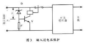 開關穩壓器的過電壓保護包括輸入過電壓保護和輸出過電壓保護。開關穩壓器所使用的未穩壓直流電源諸如蓄電池和整流器的電壓如果過高,使開關穩壓器不能正常工作,甚至損壞內部器件,因此,有必要使用輸入過電壓保護電路。用晶體管和繼電器組成的過電壓保護電路如圖3所示。