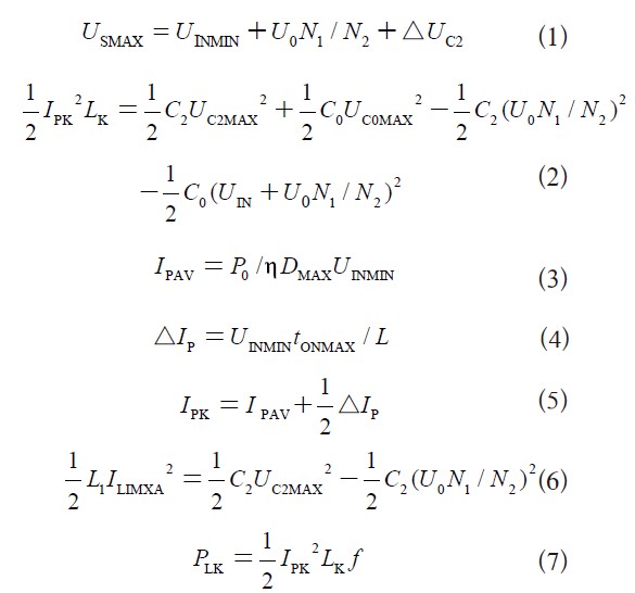 其中:USMAX即UC0MAX為功率管VT1~VT4所承受的最大電壓應力;UINMIN為輸入電壓最小值(取21V);U0為輸出電壓(取350V);N1、N2為變壓器初次級匝數(取15匝和117匝);△UC2由漏感引起的尖峰電壓;IPK為漏感即初級峰值電流;LK為初級漏感(取0.4μH);C2為外接電容(取30000pF);C0為VT1~VT4輸出電容之和(取4000pF);IPAV為功率管導通期間總電流平均值;η為電源效率(取92%);DMAX為最大占空比(取0.7);△Ip為開關管導通期電流變化量;tONMAX為開關管最大導通時間(取23μs);L為變壓器初級電感值(取38μH);IL1MAX為L1(取0.5mH)中通過的最大電流;PLK為漏感回饋到輸入端的能量;f為功率管開關頻率(取30kHz)。
