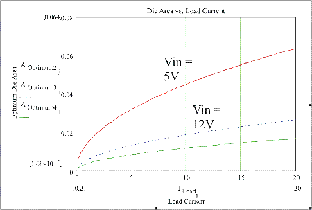 上述方程根據(jù)一組特定的固定參數(shù)清楚地確定了最優(yōu)化的裸片面積。實(shí)際上,有必要被擴(kuò)展到包含一定范圍內(nèi)的工作條件,如頻率、負(fù)載電流、輸入電壓和門(mén)驅(qū)動(dòng)條件。幸運(yùn)的是,在個(gè)人電腦市場(chǎng),輸入電壓和每相的電流被保持在相當(dāng)窄的范圍內(nèi)。這就使開(kāi)關(guān)頻率和門(mén)驅(qū)動(dòng)器成為唯一的兩個(gè)真實(shí)變量。