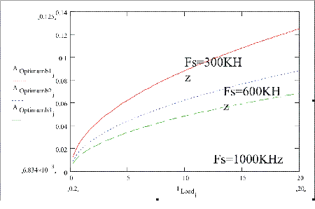 圖4:在同步整流器MOSFET不同開(kāi)關(guān)頻率上的最優(yōu)化裸片面積是負(fù)載電流的函數(shù)。