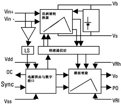 電機(jī)電流是通過使用一個外部分流晶體管來感測的,HVIC可將小的差分電壓(±250mV)通過一個精密電路轉(zhuǎn)換為時間間隔,這個精密電路的紋波去除功能有助于顯示小的群延遲。時間間隔是快速瞬變的,會被帶到輸出端。這樣就可以獲得與測量電流相對應(yīng)的模擬輸出電壓,以便與外部參考電壓相比較,最大采樣率為40kSPS。對于頻率高達(dá)20kHz的非對稱PWM調(diào)制來講,這個采樣速率富富有余。20kHz時的最大延遲小于7.5s,對于被用來IGBT保護(hù)的電流感測信號來說也夠快了。圖4是電流感測電路。