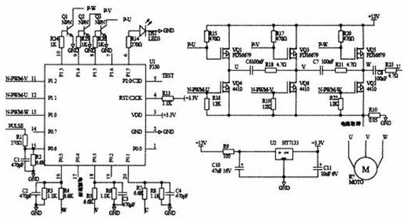 無位置傳感器控制系統(tǒng)以C8051F330單片機(jī)、逆變橋電路、端電壓檢測電路、穩(wěn)壓電路等組成。逆變橋電路中上橋臂為P型MOSFET器件FDS6679,下橋臂為N型MOSFET器件M4410B,均為低電壓驅(qū)動器件。FDS6679通過一個NPN型三極管驅(qū)動,而M4410B由C8051F330的P1口直接驅(qū)動(P1口設(shè)置成推挽輸出)。PWM控制模式定為:PWM僅應(yīng)用于半橋的下端MOSFET,同時換流的上端(對角線)MOSFET僅起換相通斷控制。