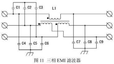 在電源電纜上的干擾具有共模和差模電流分量,在IGBT逆變焊機(jī)中共模干擾是主要治理對象,圖11是一種共模、差模兼顧的三相EMI濾波器。C4~C9、L1主要用于共模干擾的濾出,L1的漏抗和C1~3用于差模干擾的濾出。