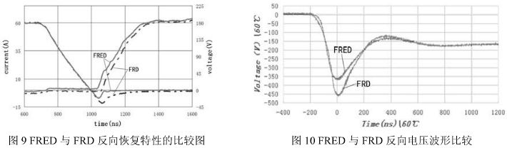 例如FRED就較一般的FRD在恢復(fù)時間、反向電壓等方面有一定的優(yōu)勢。圖9是一種國產(chǎn)FRED與進(jìn)口FRD反向恢復(fù)特性的比較,圖10是國產(chǎn)FRED與進(jìn)口FRD反向電壓波形比較。
