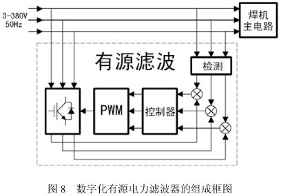 有源濾波器原理如圖 8 所示。通過檢測電路對負(fù)載端(焊機(jī)主電路)的電壓、電流進(jìn)行檢測,然后送入控制電路進(jìn)行計算分析,輸出相應(yīng)的脈沖驅(qū)動 IGBT,產(chǎn)生與負(fù)載電流中的諧波電流大小相等方向相反的電流,從而達(dá)到補(bǔ)償負(fù)載電流中的諧波分量和無功功率的目的。逆變器工作時所需要的能量由儲能電路供給,該儲能電路是通過逆變器中的各個 IGBT 的反并聯(lián)二極管進(jìn)行充電,同時又在 IGBT 開通時輸出能量,使諧波電流分量和無功功率得到補(bǔ)償。這樣,電網(wǎng)的輸入電流可實(shí)現(xiàn)為正弦波形。 有源濾波器動態(tài)響應(yīng)迅速,濾除諧波可達(dá)到 95%以上,補(bǔ)償無功細(xì)致。但有源濾波器由于電路復(fù)雜,材料成本高,運(yùn)行可靠性也不及無源濾波電路,對市場價格競爭異常激烈的 ZX7、NB 系列逆變焊機(jī)而言不太適用,但對需要作精細(xì)控制的數(shù)字化焊機(jī)而言,可能有源濾波才是其最佳選擇。