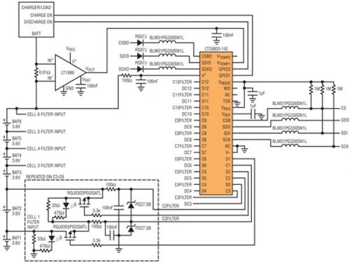 圖 1:6 節電池監視系統的簡化原理圖。LTC6803 測量電池電壓并