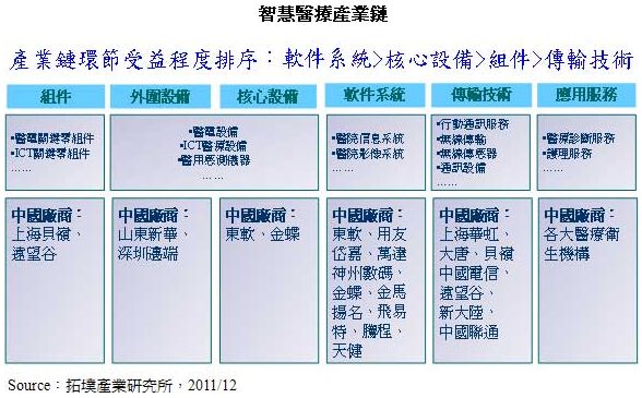 除智能電網之外,蘊藏1,200億元人民幣商機的智能醫療產業,也是臺廠切入大陸物聯網市場另一個機會點。大陸“新醫改”將配合“健康中國2020”發展目標,以政策為導向推動改革規劃,十二五期間將投入8,500億元人民幣,循此戰略規劃全面提升中國大陸醫療水準。