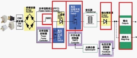 在一個電源設計中,能效規(guī)范對電路段的挑戰(zhàn)主要體現(xiàn)在PFC能效、主轉(zhuǎn)換器能效和次級能效幾個方面。要提高這幾個方面的能效,就必須改善如圖1所示電路紅色框中的元件性能。以下將介紹改善電路段能效的幾種方法。