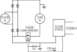 在某型地面車輛上裝備了一套獨立的大功率發電系統,該發電系統設計選用了CHB-300S型閉環霍爾電流傳感器作為系統電流檢測部件,通過對傳感器的輸出信號進行處理,設定限流工作點,確保發電系統的輸出功率不高于發電機的額定功率。閉環霍爾電流傳感器CHB-300S的應用,很好地實現了上述應用目的。如圖3所示,發電機G輸出正端匯流母線穿過CHB-300S/SP1的原邊電流穿孔,由傳感器CHB-300S/SP1檢測發電機的輸出電流,傳感器的輸出IM與發電機控制盒相連,由發電機控制盒設定發電機的輸出電流控制點,依據此信號,對發電機的輸出電流加以限制,避免發電機因輸出功率過高而發生故障或損壞,從而保證發電系統正常工作。
