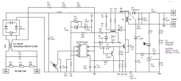 - 采用NCP1250設計65W適配器示例