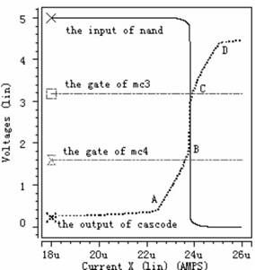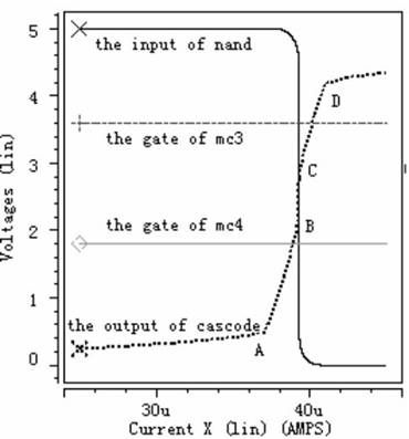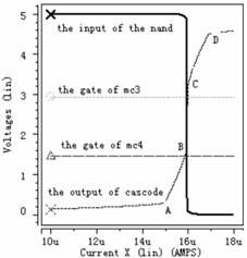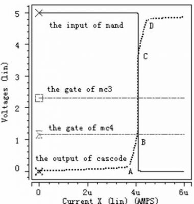 從虛線即cascode 結(jié)構(gòu)的輸出電壓波形可以看出,電流極限比較器的工作過(guò)程分為五個(gè)階段, 第一階段: 檢測(cè)電流從0 慢慢上升到A, 在此過(guò)程中, 由于檢測(cè)電流遠(yuǎn)小于極限電流, 強(qiáng)迫Mc3 和Mc4 都工作于線性區(qū)。第二階段: 檢測(cè)電流從A 上升到B, cascode結(jié)構(gòu)的輸出電壓也隨著上升, 使Mc4 工作于飽和區(qū), Mc3 工作于線性區(qū)。但是Mc4 只是剛剛進(jìn)入飽和區(qū),還受溝道調(diào)制因素影響, 這可從圖中很清析地看出當(dāng)cascode 結(jié)構(gòu)的輸出電壓隨檢測(cè)電流上升時(shí), Mc4 中電流慢慢接近所設(shè)定的極限電流。第三階段: 檢測(cè)電流從B 上升到C, 此時(shí)檢測(cè)電流已上升到所設(shè)定的極限電流, Mc3 和Mc4 都工作于飽和區(qū), 同時(shí)cascode 結(jié)構(gòu)的輸出電壓也上升到后面反相器的中點(diǎn)電壓, 經(jīng)過(guò)后續(xù)控制電路關(guān)斷功率管。第四階段:檢測(cè)電流從C 上升到D, 此時(shí)檢測(cè)電流大于所設(shè)定的極限電流, 迫使Mc5 工作于線性區(qū), 雖Mc6 還工作于飽和區(qū),但受溝道調(diào)制因素影響, 另外Mc3 和Mc4 工作于飽和區(qū)。第五階段: 檢測(cè)電流從D 繼續(xù)往上升, 迫使Mc5 和Mc6 都工作于線性區(qū),Mc3 和Mc4 工作于飽和區(qū)。從圖4 中可以看出, 當(dāng)檢測(cè)電流達(dá)到4.1μA 時(shí), 關(guān)斷功率管,滿足系統(tǒng)要求。圖5- - 圖7 的工作情況與圖4 類似, 圖5 設(shè)定極限電流為16μA, 可以看出當(dāng)檢測(cè)電流達(dá)到15.97μA 時(shí),關(guān)斷功率管。圖6 設(shè)定極限電流為24μA, 可以看出當(dāng)檢測(cè)電流達(dá)到23.82μA 時(shí), 關(guān)斷功率管。圖7 設(shè)定極限電流為40μA, 可以看出當(dāng)檢測(cè)電流達(dá)到39.6μA 時(shí), 關(guān)斷功率管。