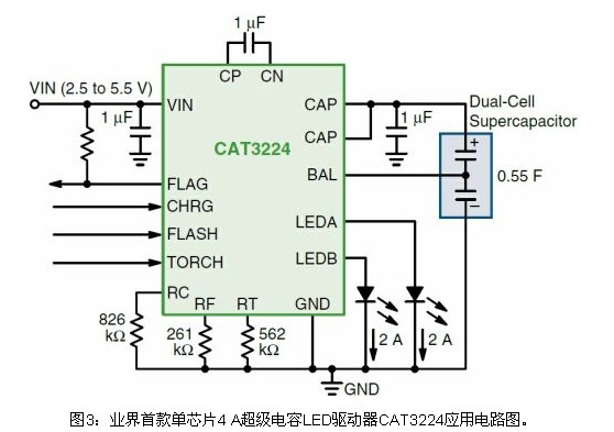 CAT3224則是業界首款4 A單芯片超級電容LED驅動器(見圖3),集成了雙模1x/2x電荷泵,提供三項關鍵功能:精密的超級電容充電控制、電流放電至LED閃光的管理,以及為LED手電筒模式提供恒流。這三種模式的工作電流能以3顆外部電阻作簡易編程,能吸收達4 A的LED閃光脈沖電流。超級電容技術的高峰值電流優勢,結合CAT3224簡單的并行邏輯接口,使這器件成為采用LED替代氙氣燈的應用的極佳選擇。
