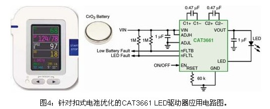 如今,越來越多的創新型便攜設備采用扣式電池(coin cell)供電,如醫療應用中的血糖儀、數字體溫計、血氧計、呼吸分析儀和生理監測儀等。由于這種電池的獨特特性以及需要長工作壽命,這些緊湊型應用需要定制的LED驅動器,不僅要管理背光,還要監測電池電量。在這類應用中,可以采用安森美半導體計劃于2010年下半年推出的CAT3661 2至2.5 V單LED驅動器。這器件同樣采用安森美半導體專利的四模(Quad Mode)電荷泵架構,能效高達92%,靜態電流低至約150 μA,提供可調節的低電池電量檢測功能,以及強固的LED故障監測、軟啟動和短路限制等保護功能,采用低高度的3 x 3 mm TQFN-16封裝,非常適合這些便攜設備應用。