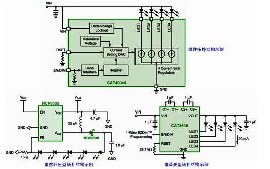 白光LED廣泛用于小型液晶顯示器(LCD)面板及鍵盤背光以及指示器應用。高亮度LED則用于手機和數碼相機的閃光光源。這些應用需要優化的驅動器解決方案,能夠延長電池使用時間、減小印制電路板(PCB)面積及高度。在這些應用領域,常見的LED驅動器方案涉及線性、電感型或電荷泵型不同拓撲結構,各有其特點。例如,電感型方案總能效最佳;電荷泵方案由于使用低高度陶瓷電容,占用的電路板面積和高度極小;線性方案非常適合色彩指示器以及簡單的背光應用。安森美半導體提供所有這三種類型拓撲結構的LED驅動器方案(參見圖1),滿足用戶不同的應用需求。