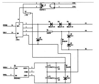 逆變器驅動電路采用日本三菱公司為驅動IGBT設計的專用集成電路M5 7962L,加少量外圍元件構成。N87C196MC輸出SPWM信號通過外圍電路放大后直接給驅動模塊,驅動模塊直接驅動IGBT管,最大可驅動400AIGBT。當M57962L檢測到IGBT管上C、E極電壓高與8V,而且此時IGBT管開通時,持續時間大于2.5 μ s,則發出故障信號,同時封鎖驅動波形,并且發出故障信號給N87C196MC,單片機產生EXTINT中斷,封鎖各路SPWM信號,高速關斷IGBT。